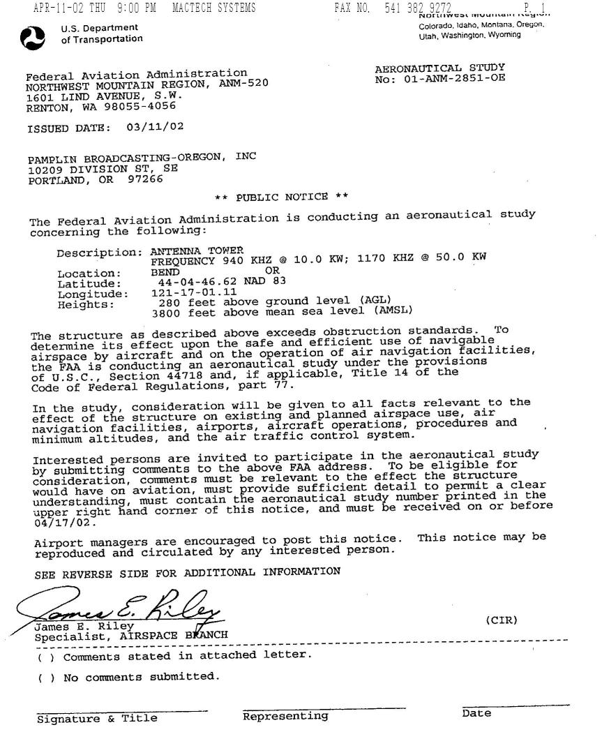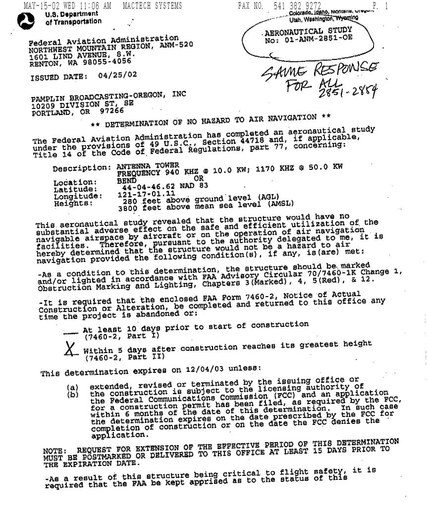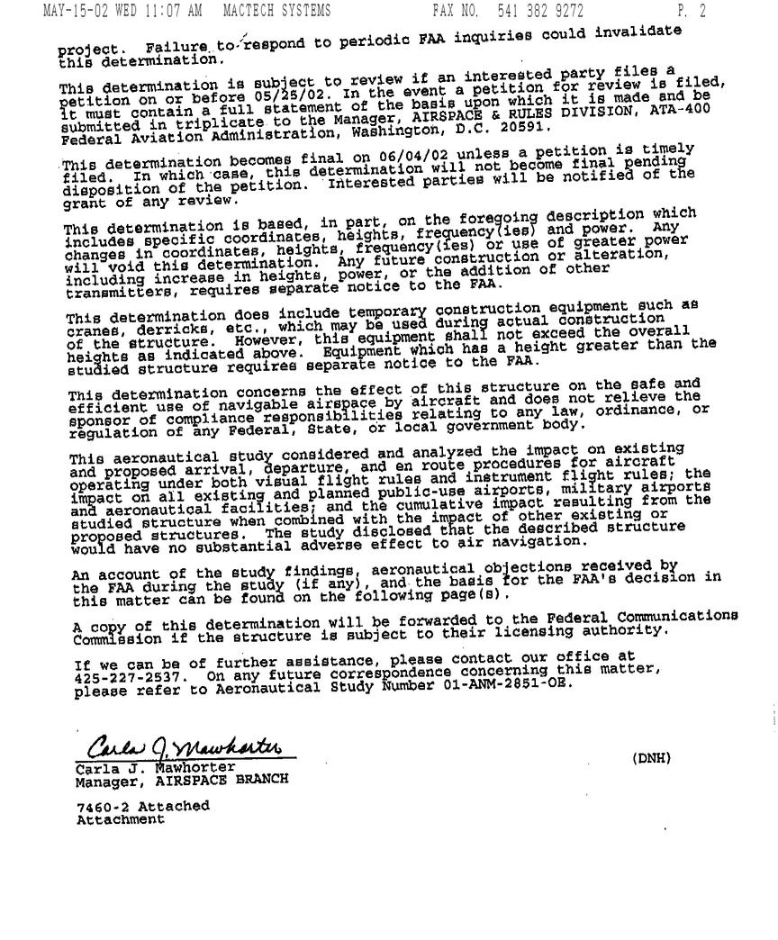 FAA PUBLIC NOTICE Aeronautical Study #01-ANM-2851-OE Page 1 Page 2