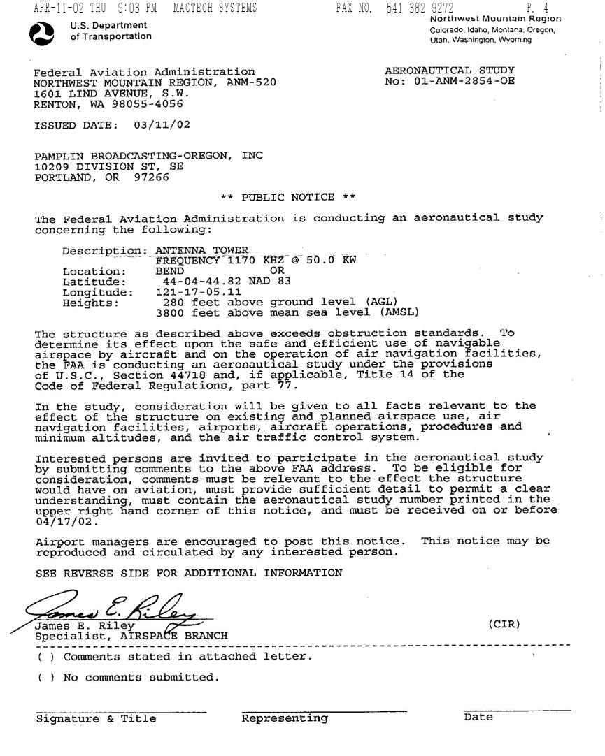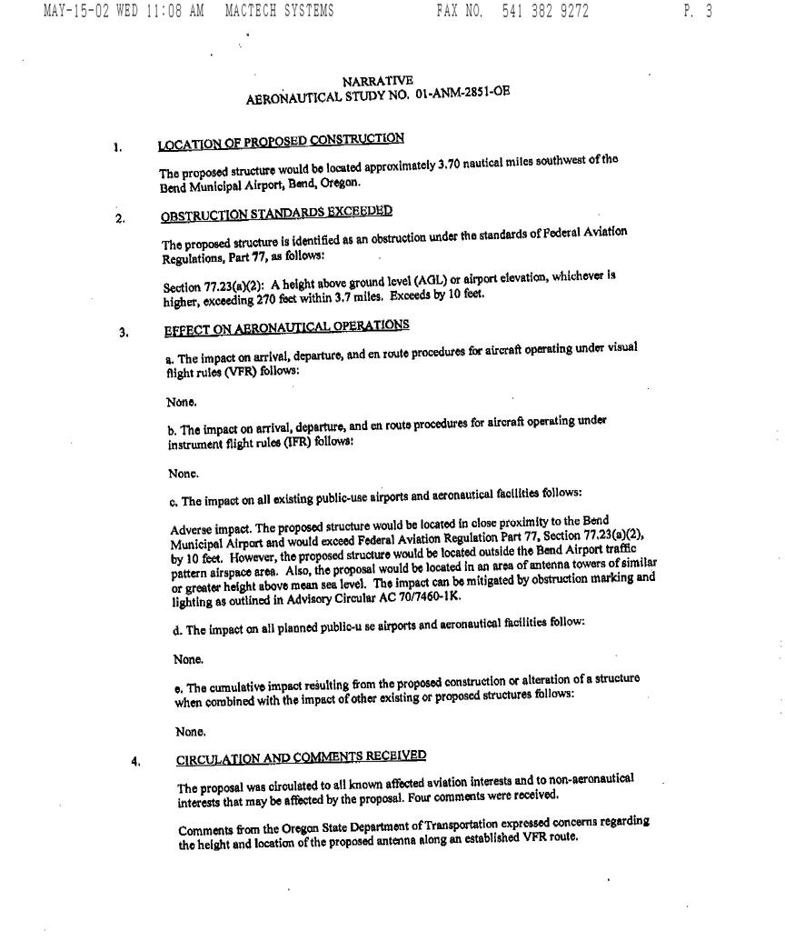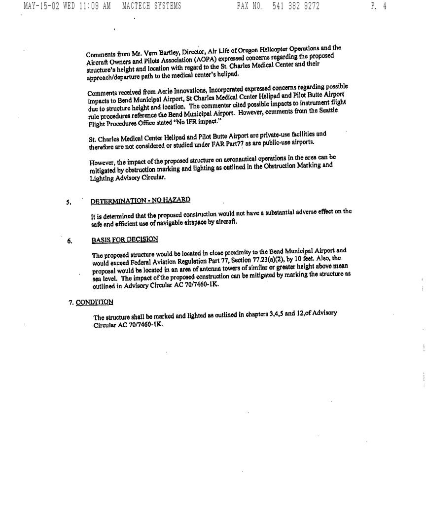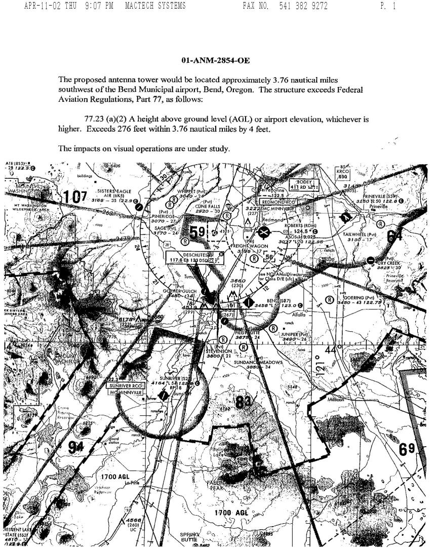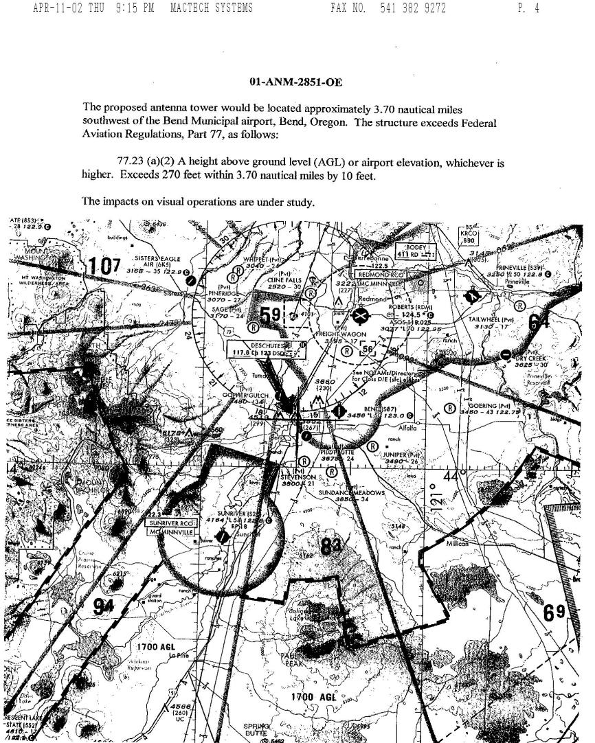 4 Proposed Antenna Towers near St. Charles Hospital FAA PUBLIC NOTICE James E. Riley, Specialist Airspace Branch The Pamplin Broadcasting - Oregon, Inc. is seeking permits for a group of four antenna towers 3.76 nm southwest of the Bend Municipal Airport (S07). The tower heights will be approximately 280 feet AGL (3800 ft. MSL). They exceed height limits in FAR 77.23 (a) (2) by 4 ft. to 12 ft. Since these structures exceed the FAA obstruction standards the FAA is conducting an aeronautical study under the provisions of U.S.C., Section 44718 and, if applicable, Title 14 of the Code of Federal Regulations, Part 77. This will help determine it's effect upon the safe and efficient use of navigable airspace by aircraft and on the operation of air navigation facilities. In the study, consideration will be given to all facts relevant to the effect of the structure on existing and planned airspace use, air navigation facilities, airports, aircraft operations, procedures and minimum altitudes, and the air traffic control system. The antenna tower group is within Latitude 44-04-44 to 44-04-47 and Longitude 121-16-59 to 121-17-05. This places the towers approximately where Stover Park is located just North of Pilot Butte off Shepard Rd. (see Figure 1). According to Air Life Director, Vern Bartley, this may pose a serious safety problem for the egress and ingress to St. Charles Medical Center via helicopter rescue flights. All members and interested persons are encouraged to participate in this aeronautical study by submitting comments to;