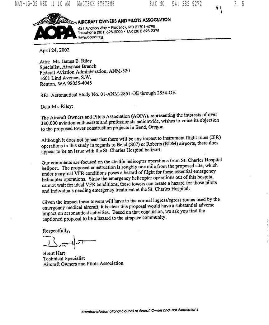 24 April 2002 AOPA wrote a letter against the proposed towers